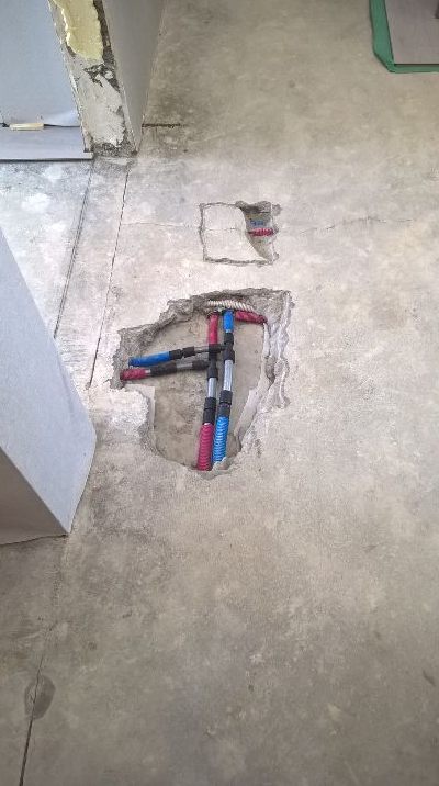 В квартире идут малярные работы и ложится плитка, т.е. пробить пол перфоратором никто не мог, да и с пятницы рабочих не было. Хорошо, что было видео, которое я снял еще до залития стяжки с прохождением всех труб и проводов. Я очень быстро добрался до стыка и….