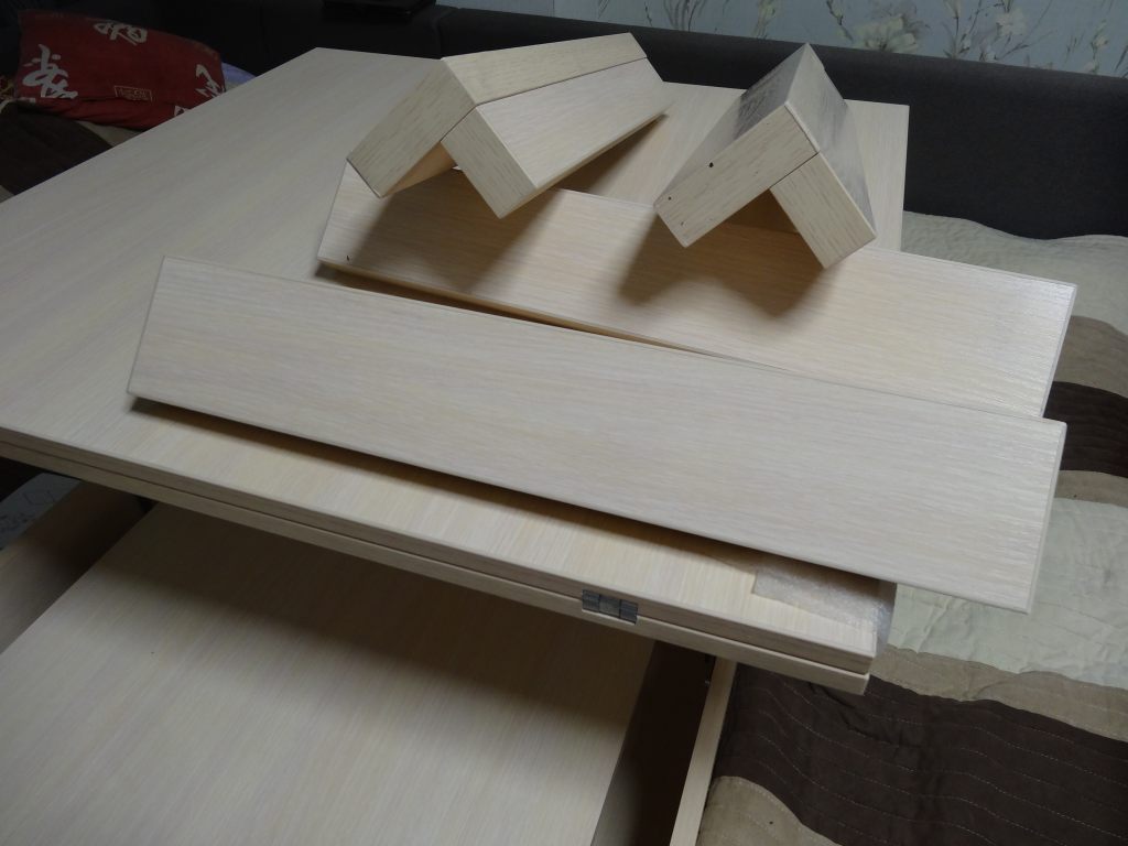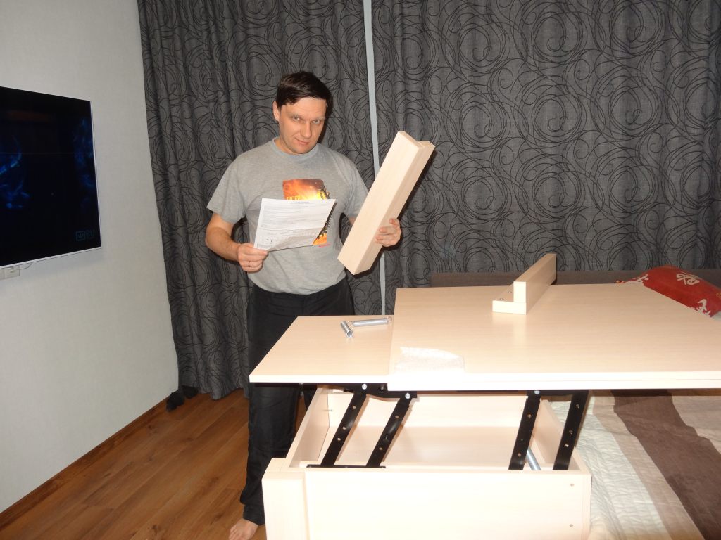 Несмотря на то, что нужно прикрутить только ножки, инструкцию по сборке стола-трансформера все-равно пришлось читать. В комплекте еще идут подставки, которые прикручиваются снизу на ножки, но, т.к. у нас он будет стоять на ламинате, то мы их не прикручивали, а наклеили войлочные накладки.